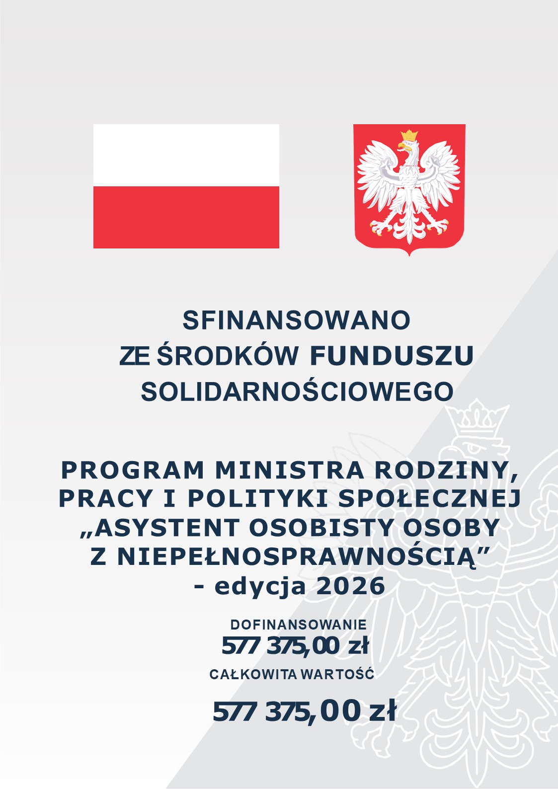 Gmina Złotów w dniu 23 stycznia 2026 roku zawarła umowę w sprawie realizacji zadania w ramach resortowego Programu Ministra Rodziny, Pracy i Polityki Społecznej „Asystent osobisty osoby z niepełnosprawnością” dla Jednostek Samorządu Terytorialnego – edycja 2026, którego realizatorem jest Gminny Ośrodek Pomocy Społecznej w Złotowie. Całkowita kwota dofinansowania wynosi 577 375,00 zł, co stanowi 100% kwoty realizacji zadania. Program jest finansowany ze środków Funduszu Solidarnościowego.