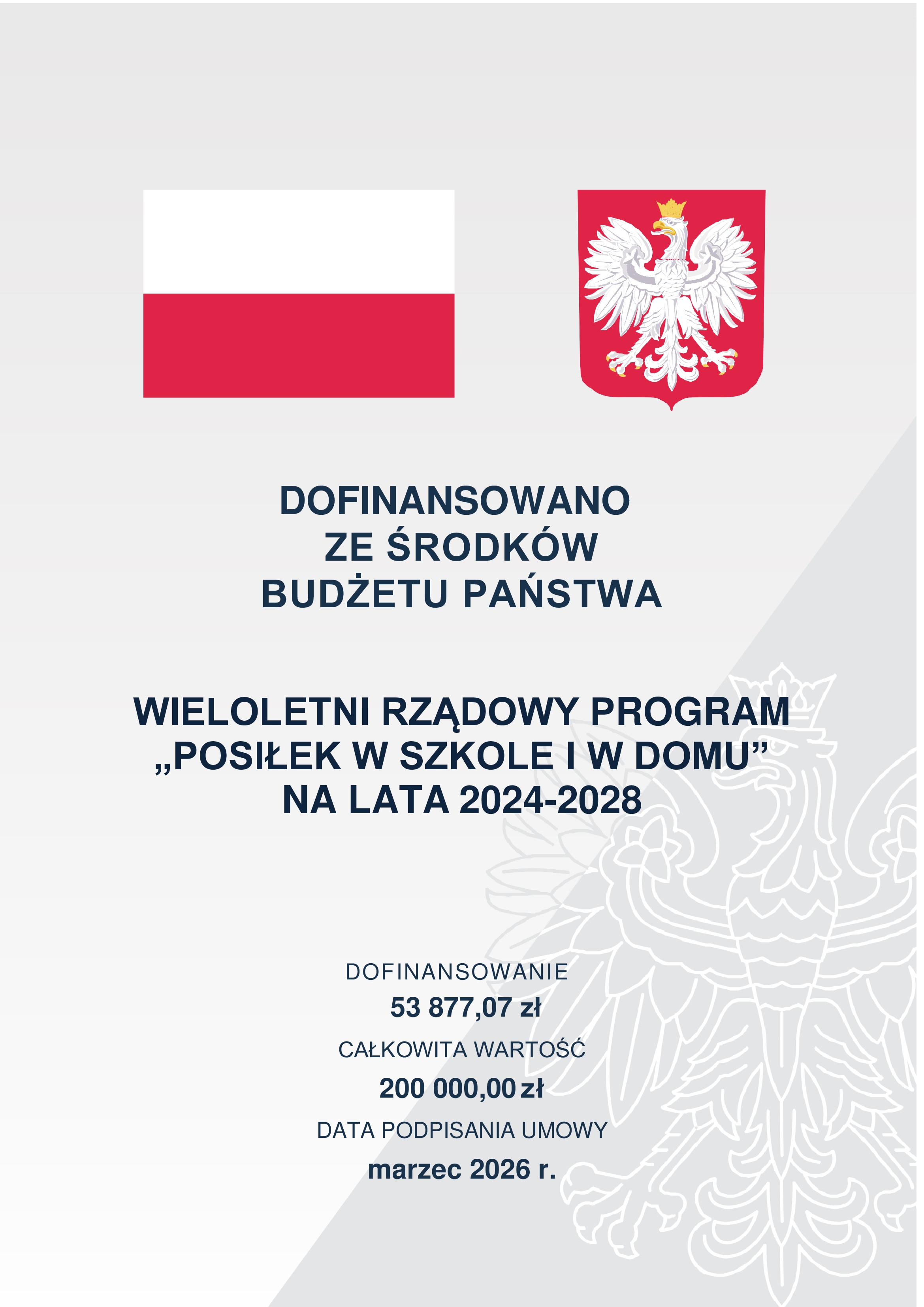 FINANSOWANIE PROGRAMU - środki własne gminy oraz dotacja z budżetu państwa otrzymana w ramach dofinansowania wieloletniego rządowego programu „Posiłek w szkole i w domu” na lata 2024 – 2028.